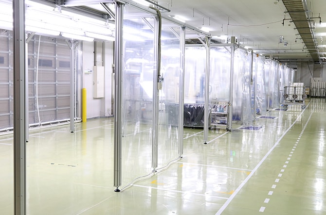 クリーン工場では、クリーンルーム(60m×30m・クリーン度レベル10000以下)を完備。さらに、クリーンブース内ではレベル10以下まで保つことができます。